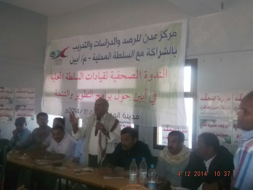 اقيمت صباح اليوم بمديرية المحفد محافظة ابين ندوة اعلامية و توعوية بحضور السلطة المحلية بالمحافظة والمديرية ومنظمات المجتمع المدني وعدد من الشخصيات الاجتماعية بالمديرية برعاية مركز عدن للرصد والدراسات والتدريب بالشراكة مع المكتب الاعلامي في محافظة ابين.