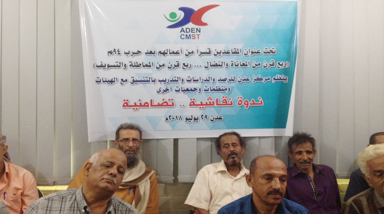 نظم مركز عدن للرصد والدراسات والتدريب ندوة نقاشية نوعية حول تطورات قضية المقاعدين قسراً من عسكريين وأمنيين ومدنيين، وذلك يوم الأحد 29/7/2018م في مقر المركز، شارك فيها حقوقيين وناشطين وإعلاميين ونساء وشباب، بالإضافة إلى أعضاء الهيئات والجمعيات التي تمثل أطراف هذه الشريحة الواسعة.